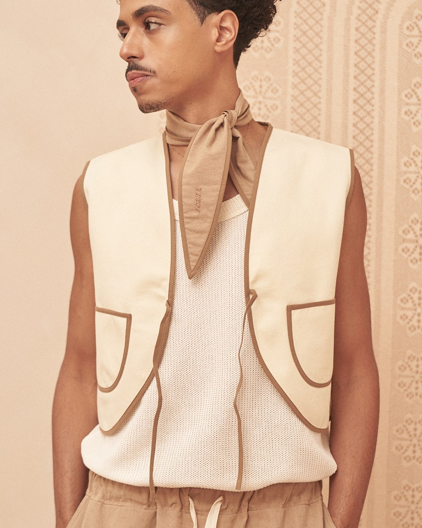 Our Caffè e Crema Gilet, a minimal yet striking piece featuring two front pockets with contrasting binding trim around the edges and ties. A easy summer piece to throw on and go. Made from deadstock fabric.