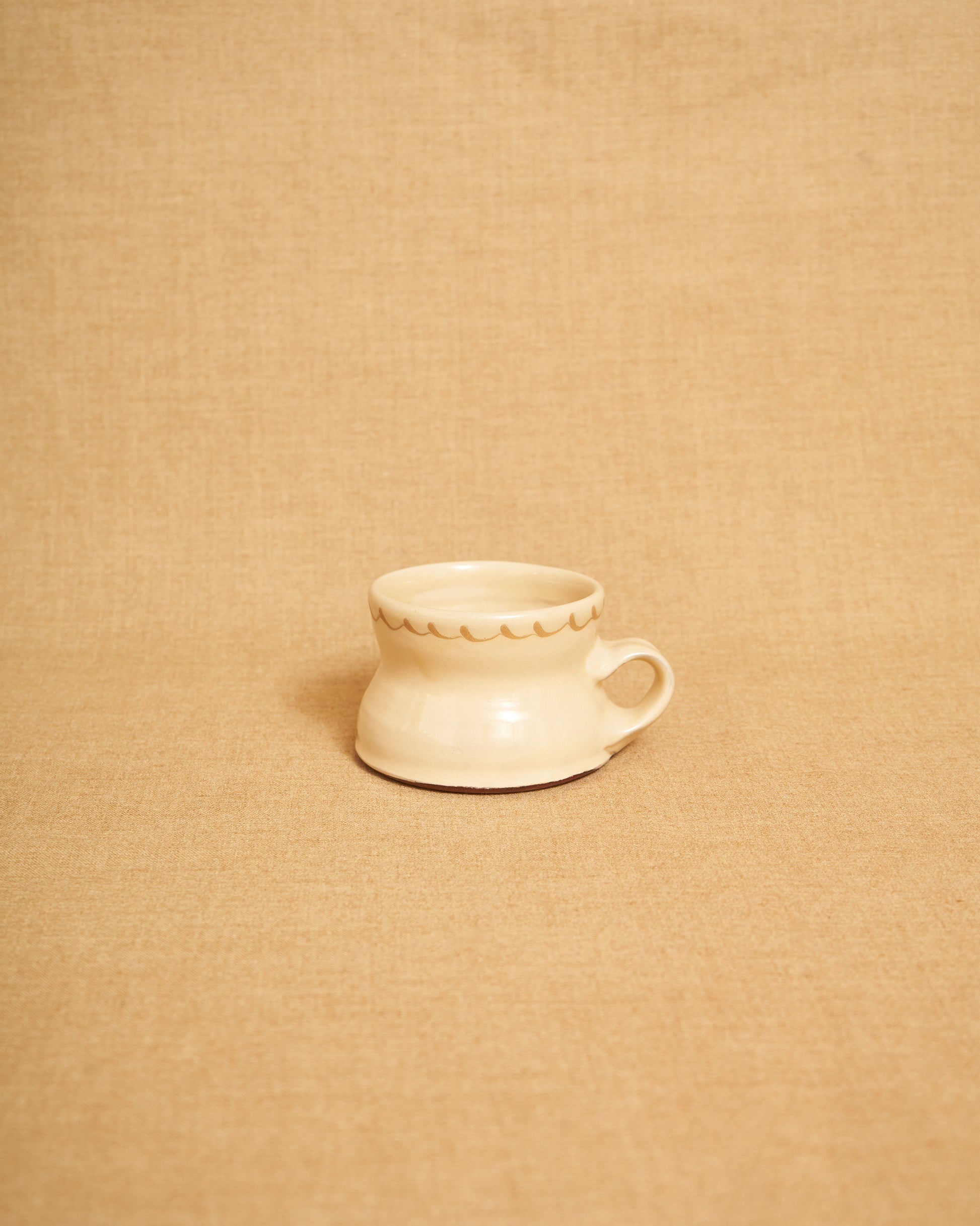 Our Cuore Cup, part of our io e te x frances savage collaboration is the second instalment consisting of beautiful homeware inspired by our latest collection 'Cuore'. We worked closely with Frances to create these unique ceramic pieces, paying special attention to detail adding hand painted borders to the edges, mirroring our embroidered clothing and accessories in the Crema and Caffè colourway.