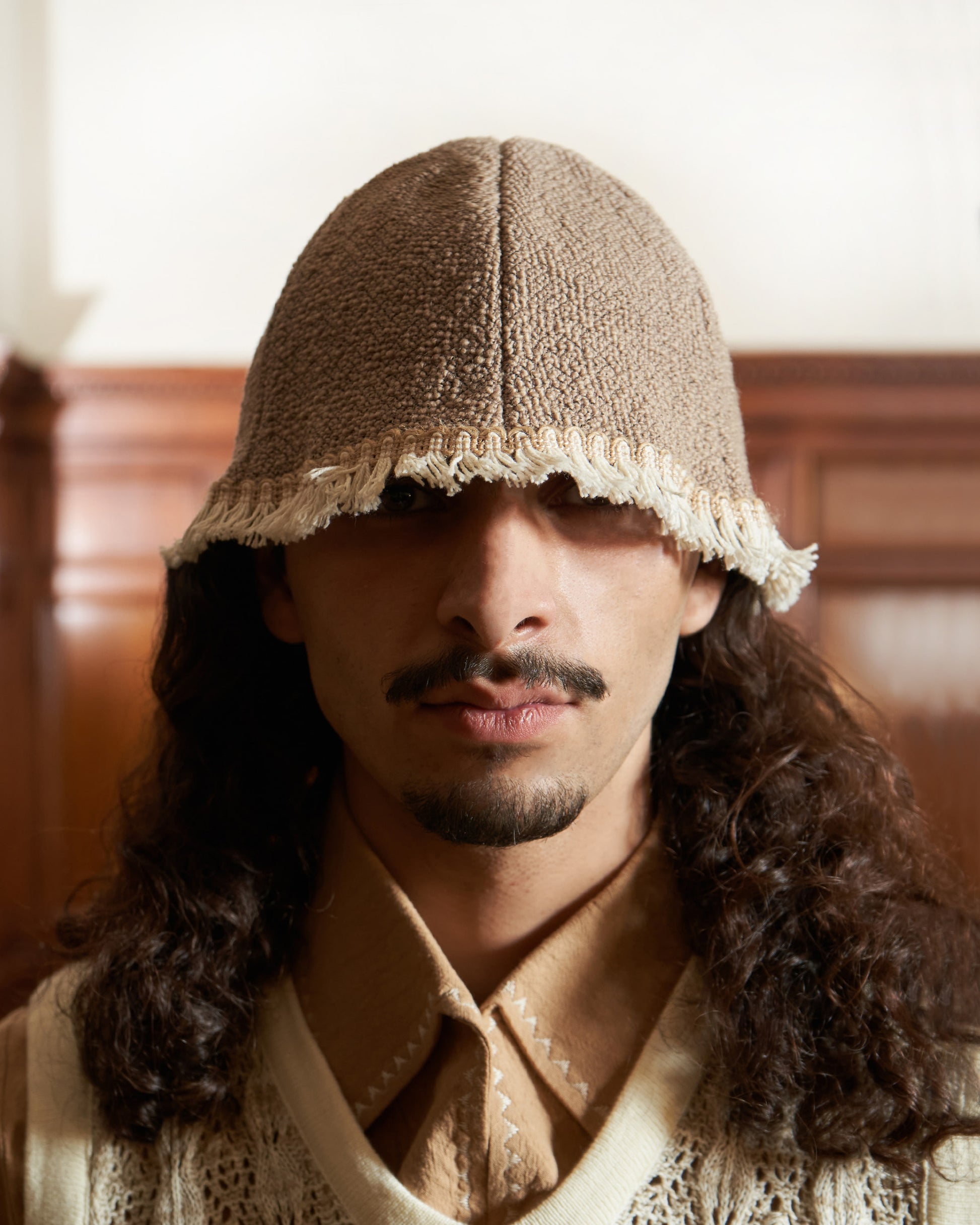 Our Cuore Tassel Hat, created and reimagined from deadstock fabric. At io e te we reuse material offcuts to recreate and upcycle pieces. This unique bucket hat has an interesting raised texture with contrasting scallop fringe edging. Each hat has been made by hand and is extremely limited making this a rare piece.