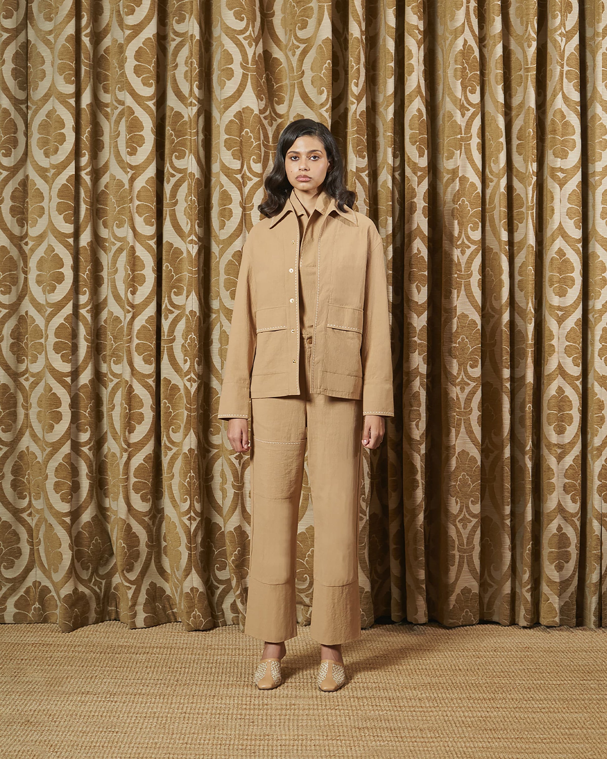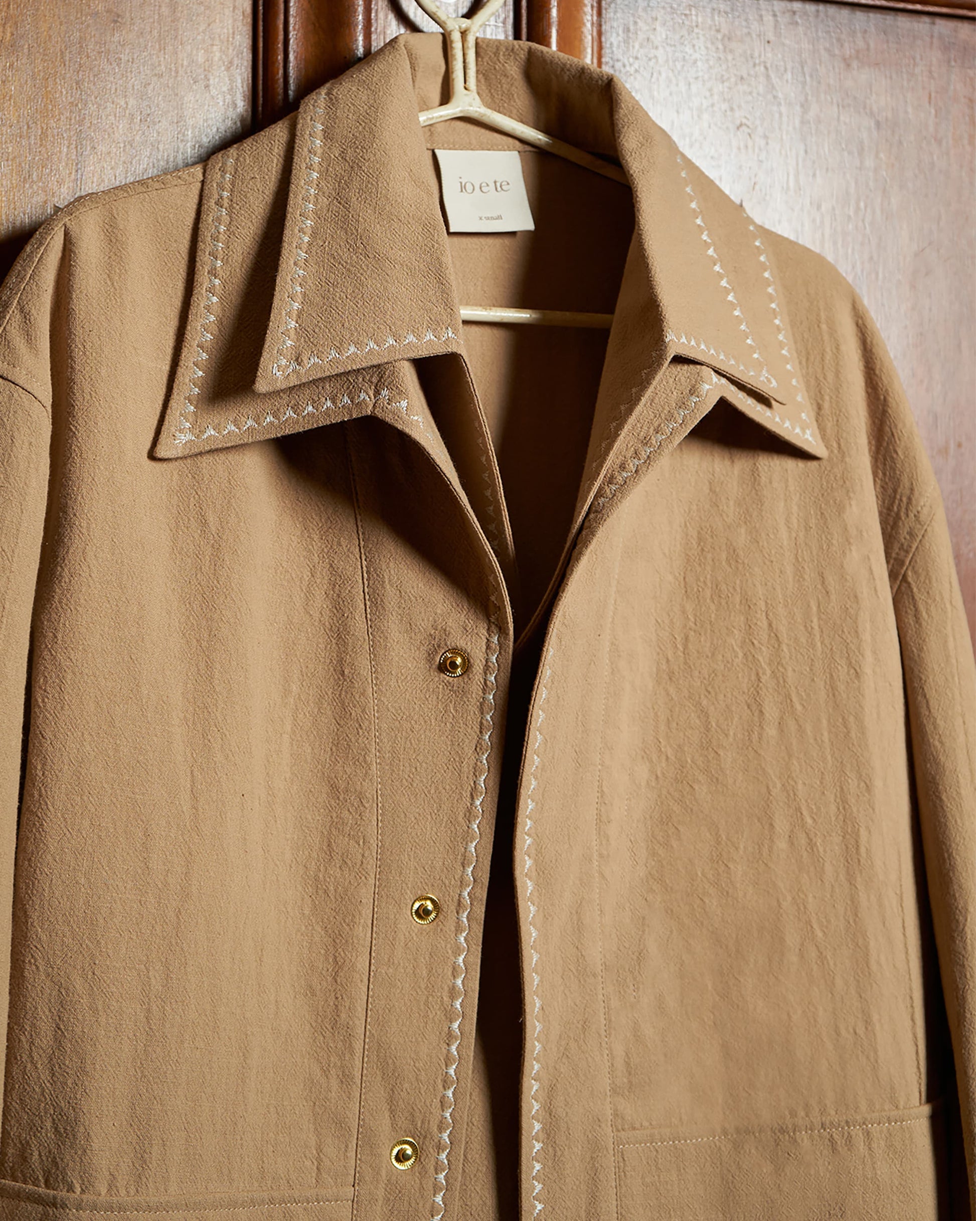 Our Cuore Jacket is a wardrobe staple, embodying our new core range of wearability and design. It has a smart relaxed fit with a clean finish. The vintage inspired collar is bordered with intricate embroidery which flows throughout the garment, onto the front pockets and sleeves with hidden popper fastenings. Lined inside with natural seeded cotton, there is an inner pocket to keep your belongings safe.