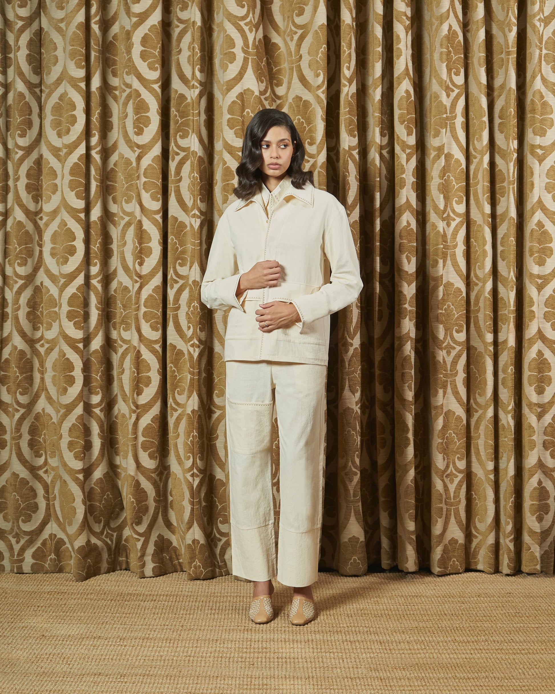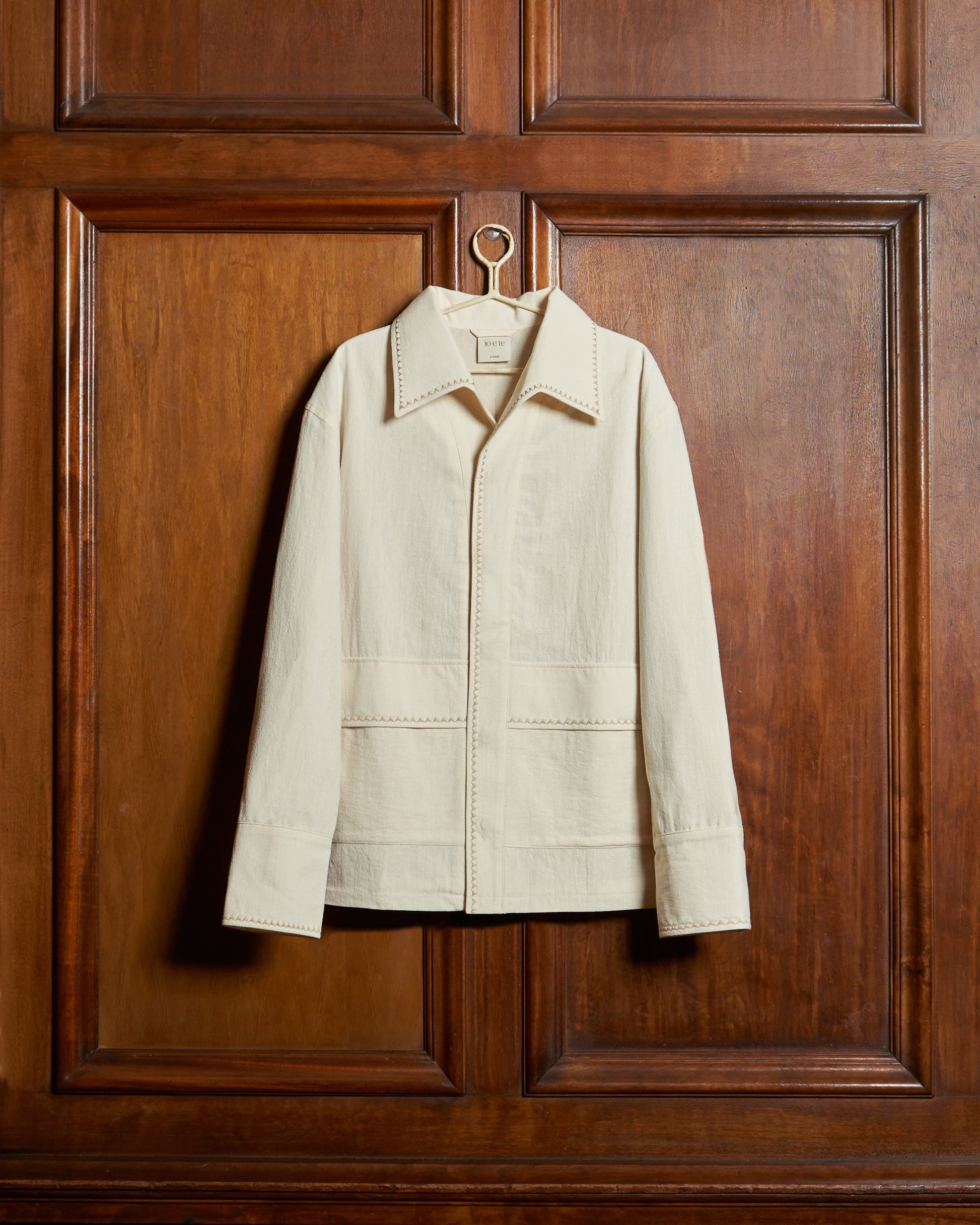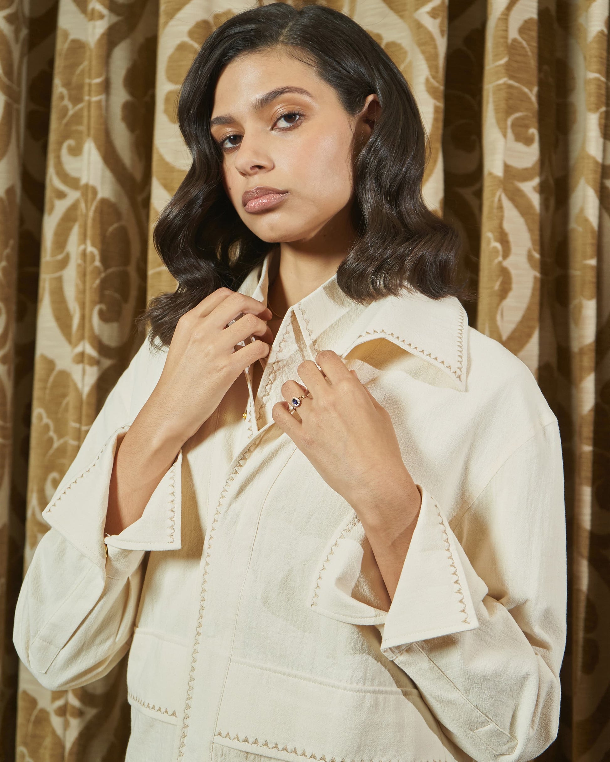 Our Cuore Jacket is a wardrobe staple, embodying our new core range of wearability and design. It has a smart relaxed fit with a clean finish. The vintage inspired collar is bordered with intricate embroidery which flows throughout the garment, onto the front pockets and sleeves with hidden popper fastenings. Lined inside with natural seeded cotton, there is an inner pocket to keep your belongings safe.