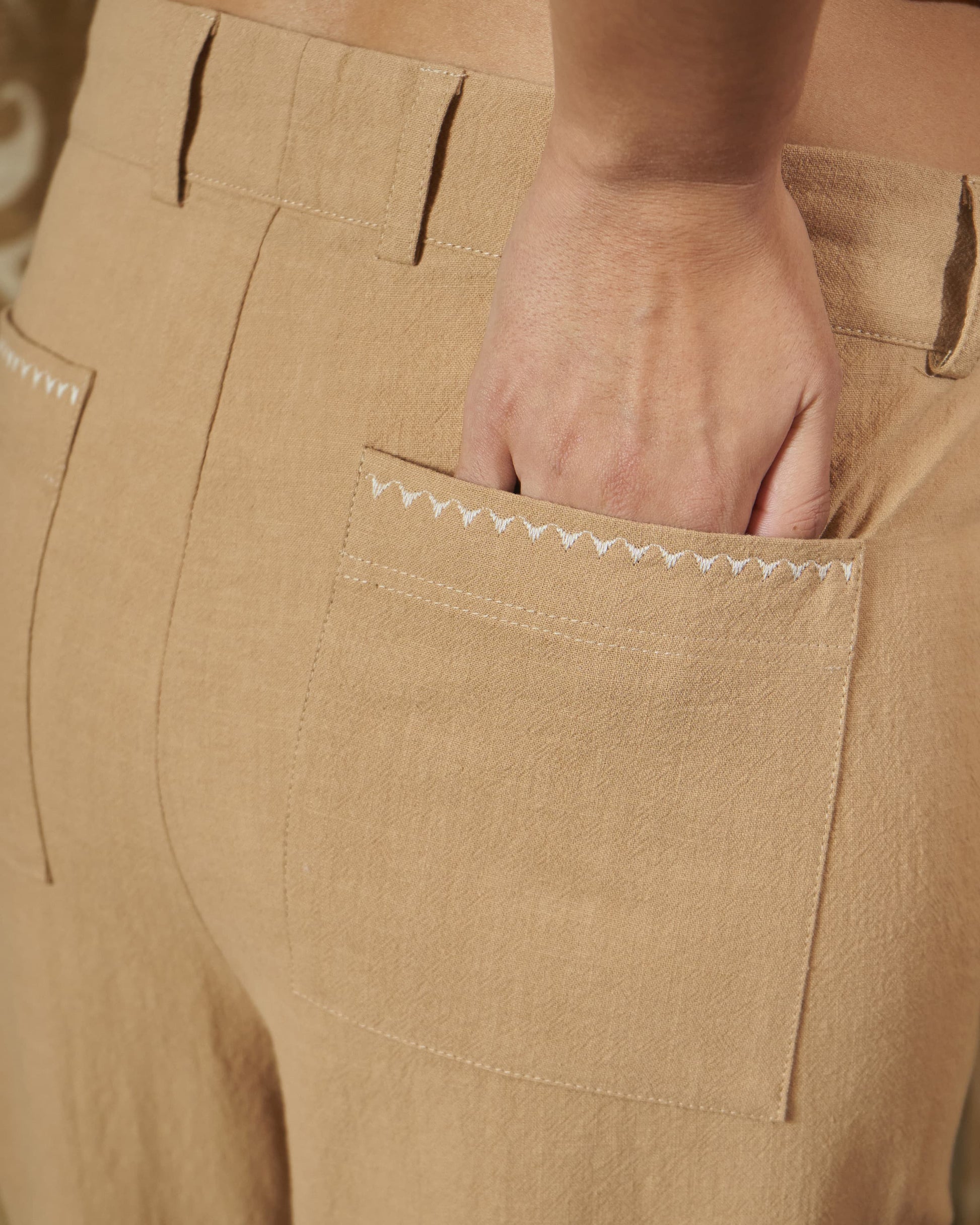 Our Cuore Trouser, taking inspiration from our previous collections and redesigned into our new core range. A true wardrobe essential embracing functionality and style. A smart relaxed fit with clean finish, features our classic high cuff and large front pocket, an io e te statement design, with added side pockets and embroidered back pockets. Looped waistline for the option of an added accessory and inner ties to ensure the perfect fit.
