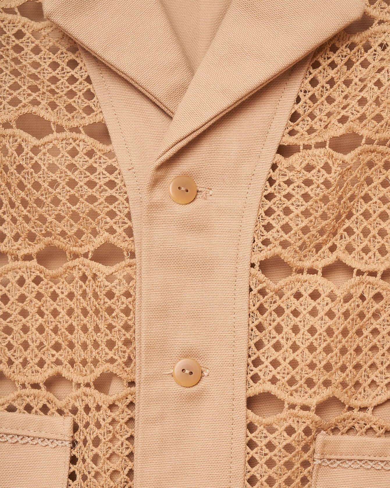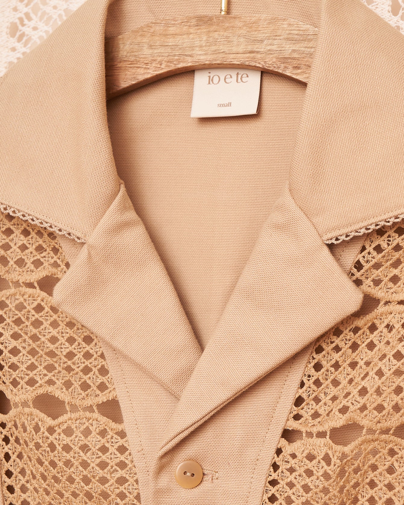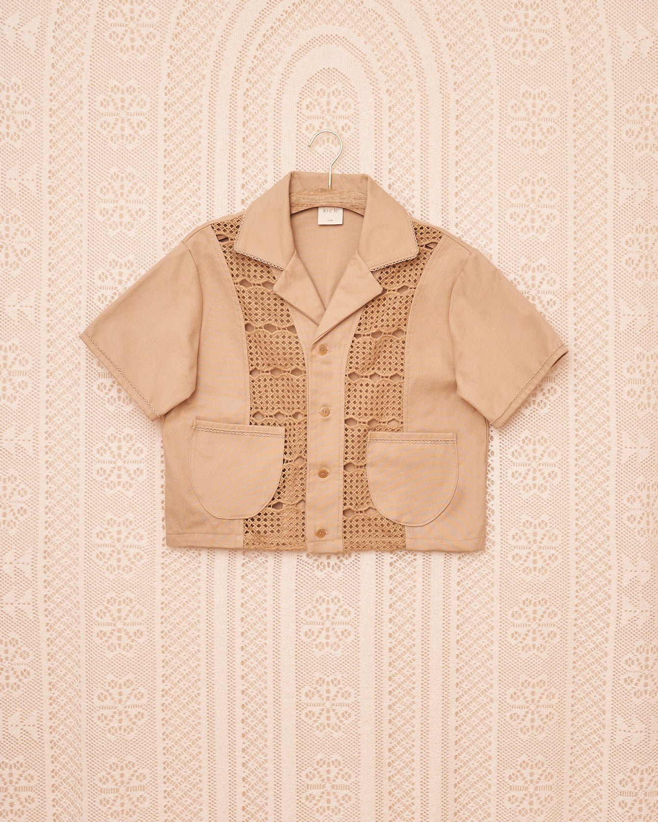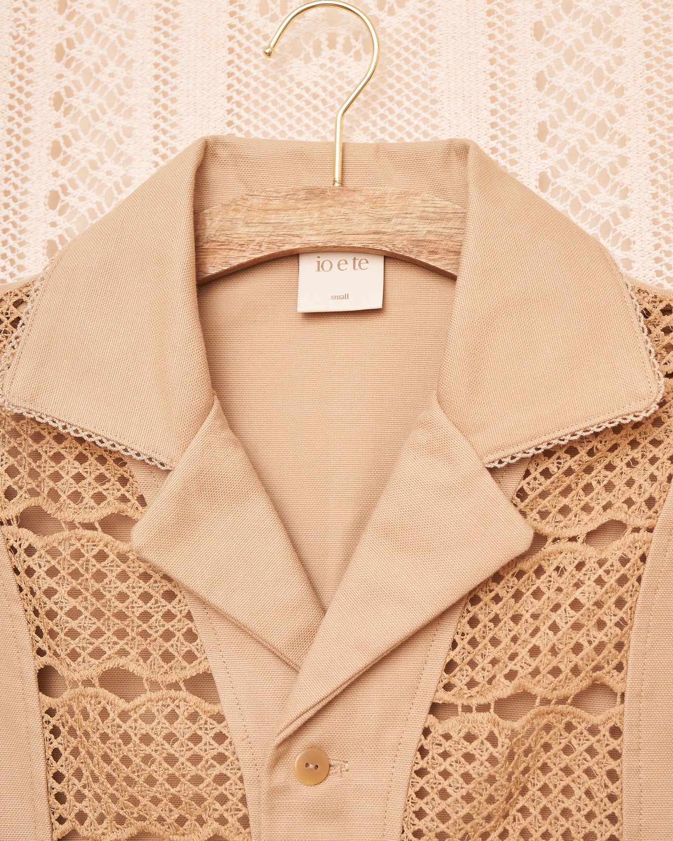 Our Estate Shirt, based on the silhouette of our previous Ricami Shirt reimagined for Summer. A cropped, oversized style shirt featuring lace panels reminiscent of handmade tablecloths found in Nonna's house, two beautifully trimmed front pockets, matching collar and sleeve trim with a front button closure. Our Brown version of the Estate Shirt, made from deadstock fabric and vintage lace.