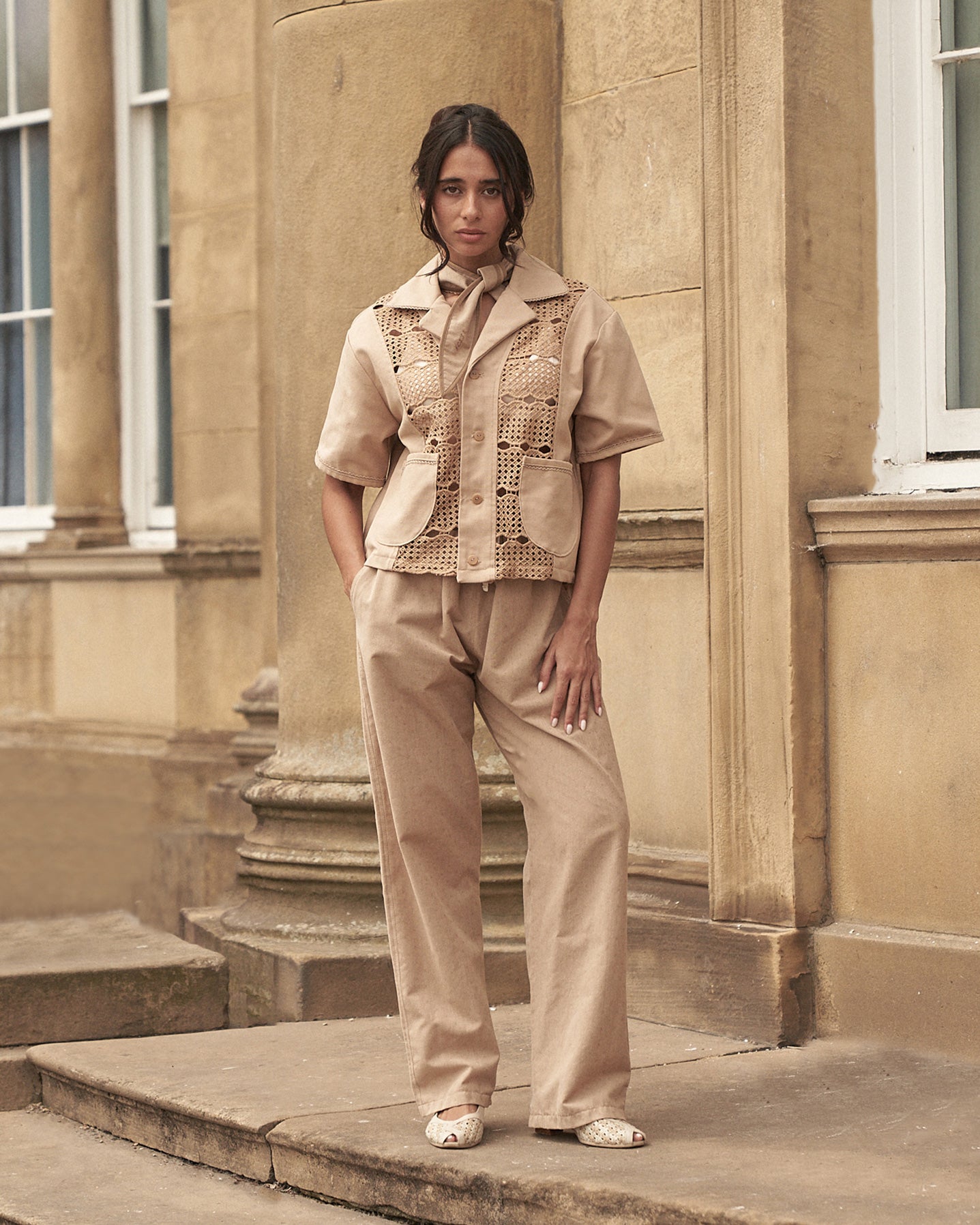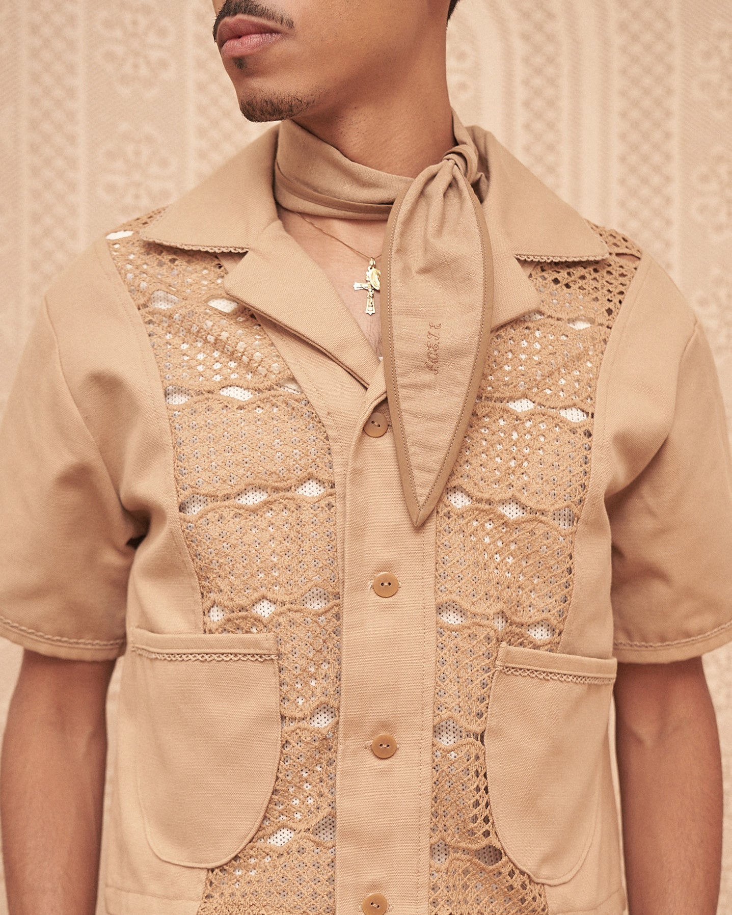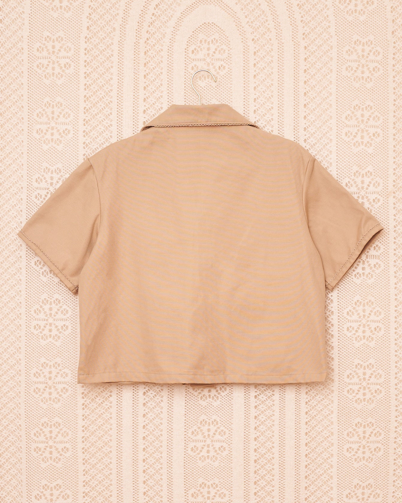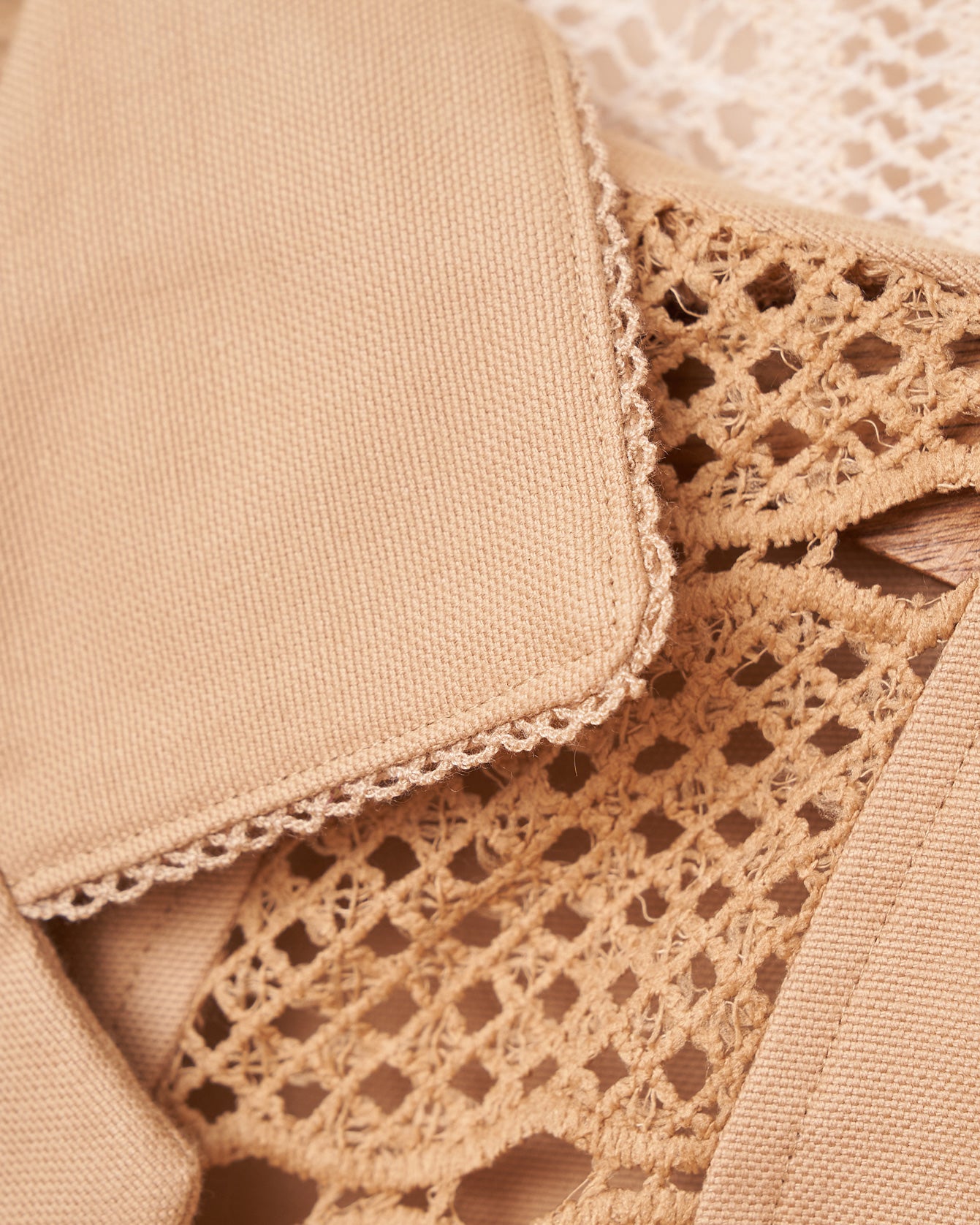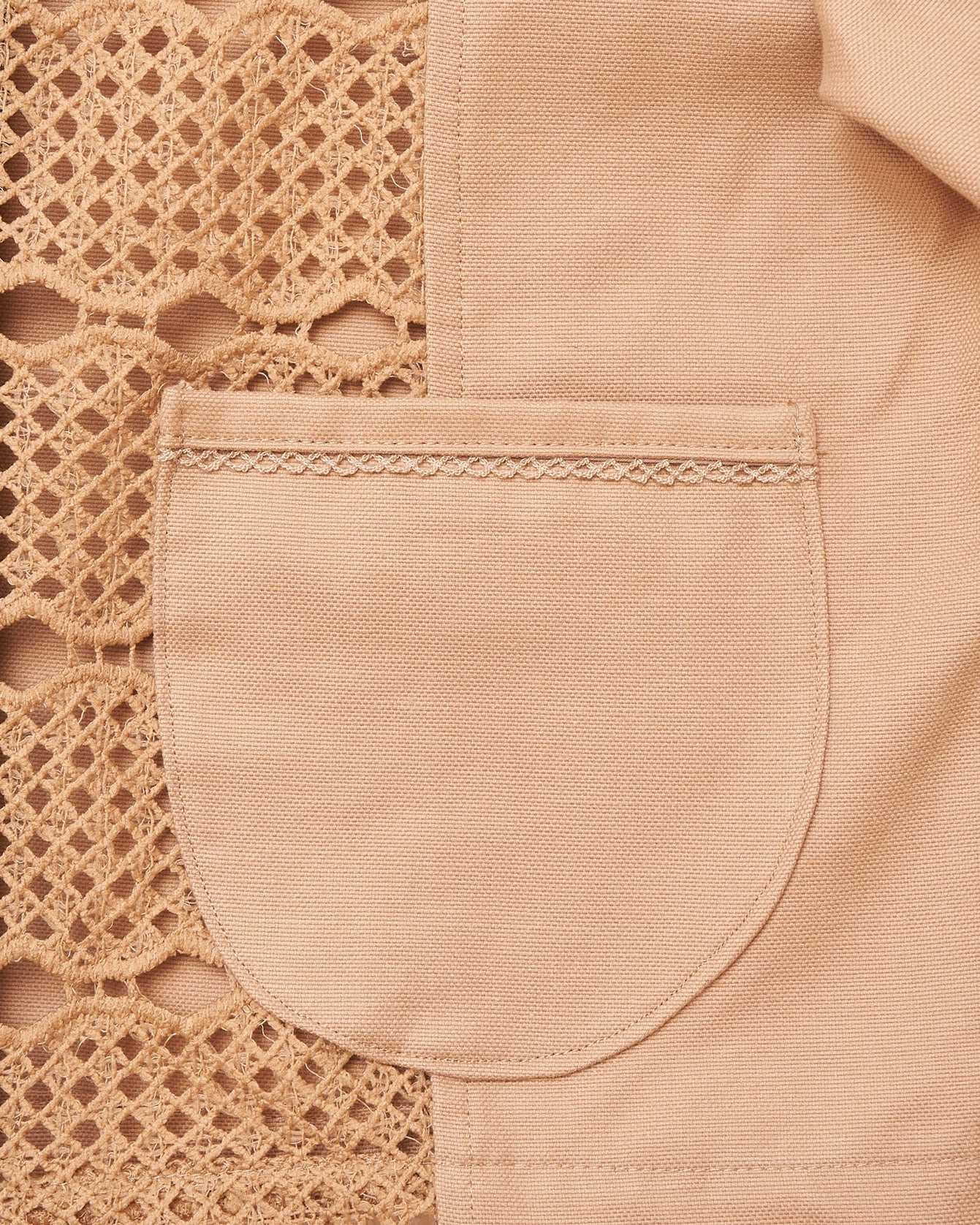 Our Estate Shirt, based on the silhouette of our previous Ricami Shirt reimagined for Summer. A cropped, oversized style shirt featuring lace panels reminiscent of handmade tablecloths found in Nonna's house, two beautifully trimmed front pockets, matching collar and sleeve trim with a front button closure. Our Brown version of the Estate Shirt, made from deadstock fabric and vintage lace.