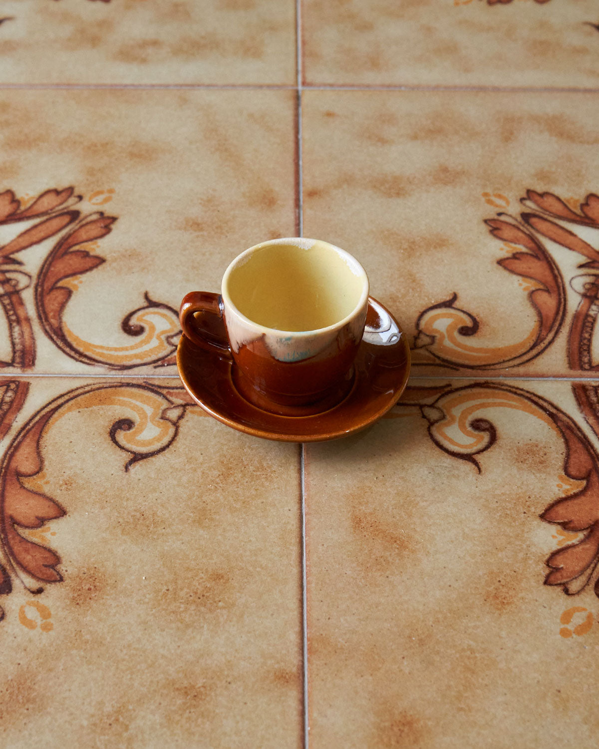 Handmade espresso set, cup and matching saucer with two toned design. Deep mahogany brown base with light cream top, perfect for espresso and cortado.