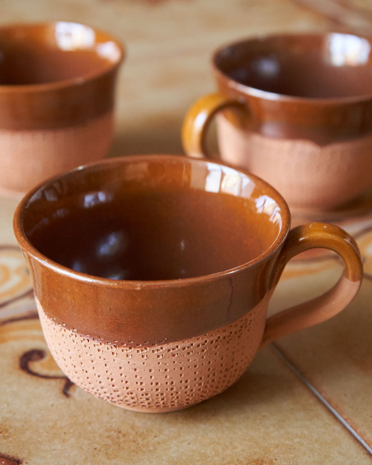 Hand made half glazed cup with split textured design. The top and inside is finished in a smooth glaze, the bottom is a traditional Italian clay finish with patterned design.