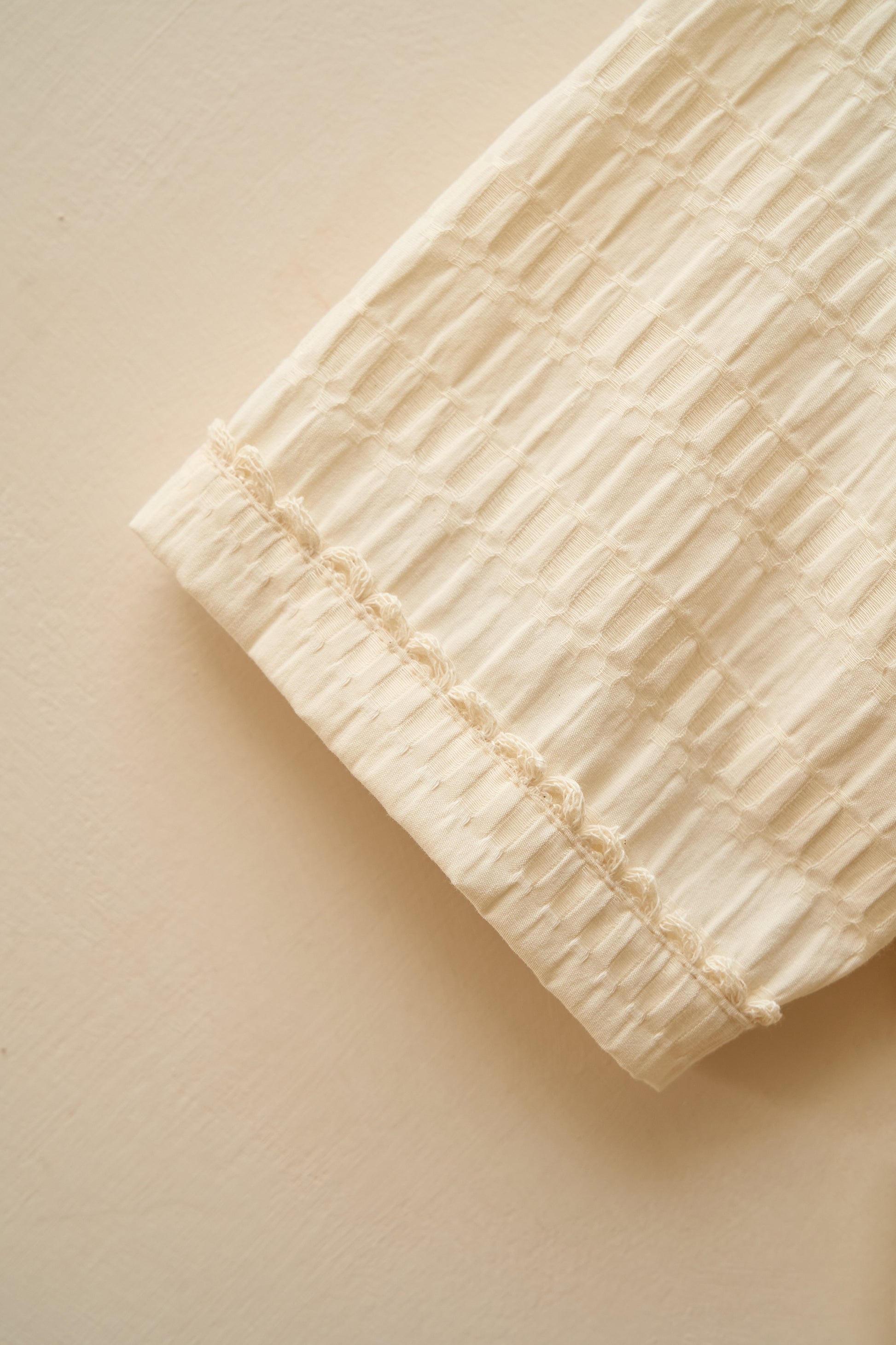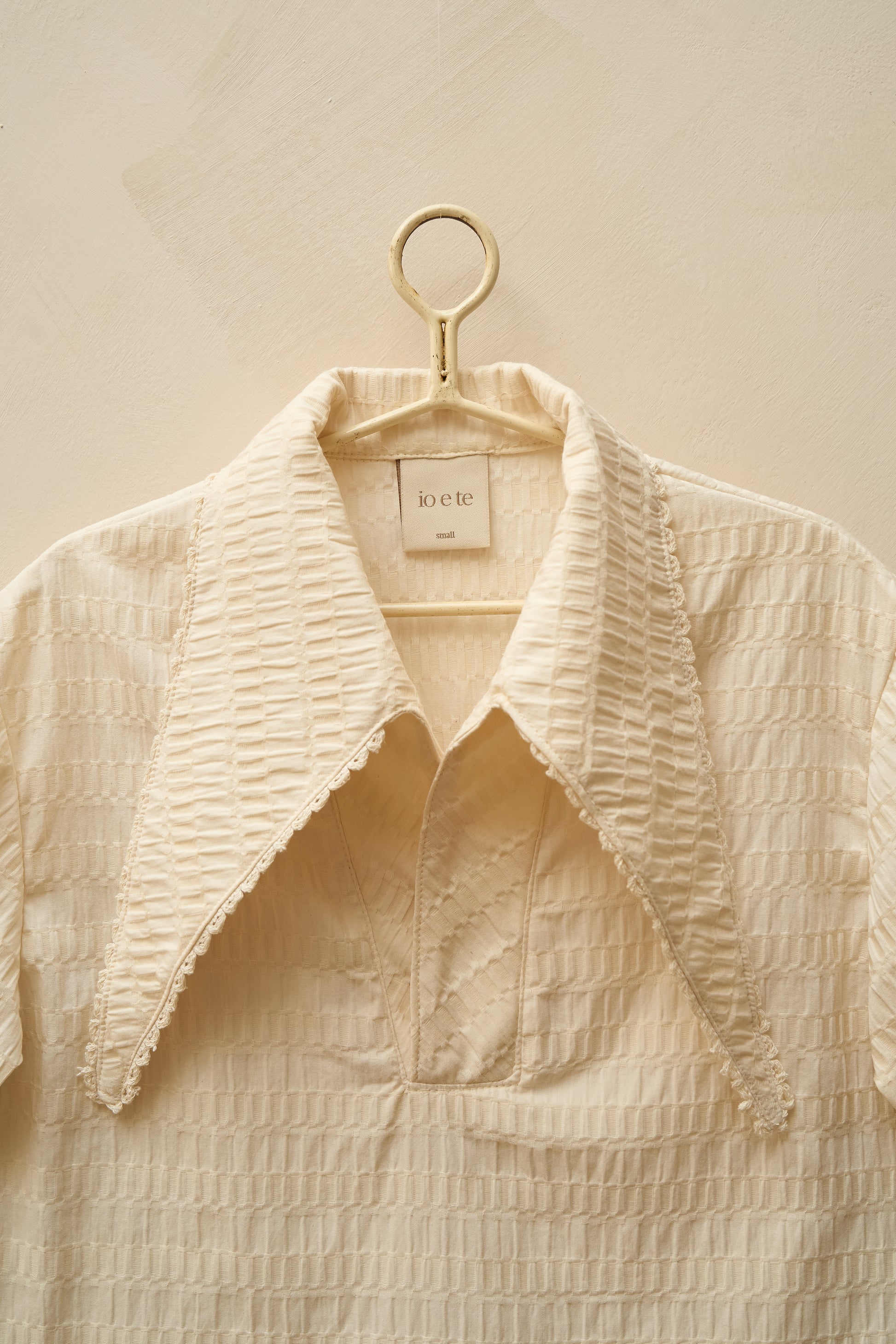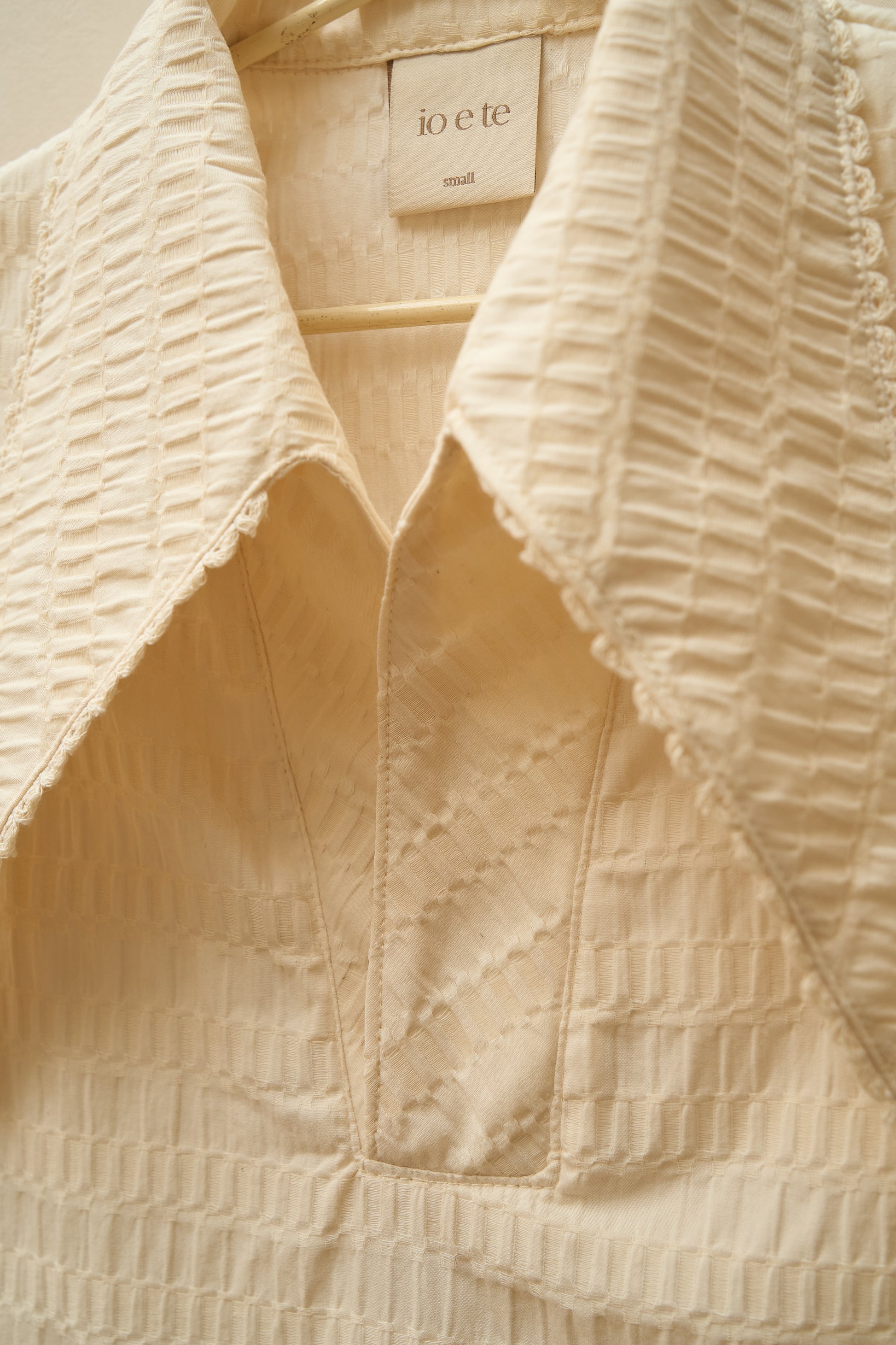 Our Inverno Shirt, inspired by the seventies is made from textured, deadstock fabric, featuring an oversized collar with detailed trim, which can be tied into a necktie. A boxy fit shirt that is a true statement piece for any wardrobe.