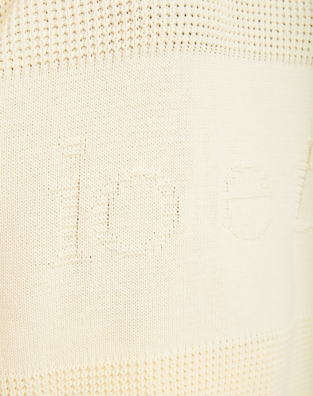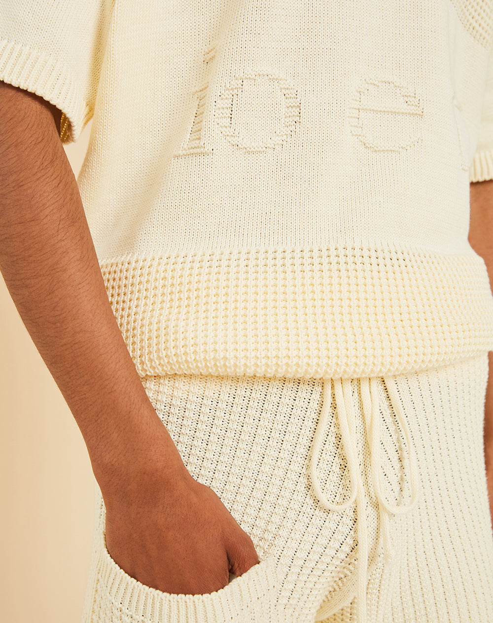 Knitted textured polo shirt with pearl knitted io e te branding. The style is inspired by a polo shirt worn in the 70s by a family member. The name originates from a nickname they adopted as a child - 'Lupo Di Mare' which means 'Wolf of the Sea'.