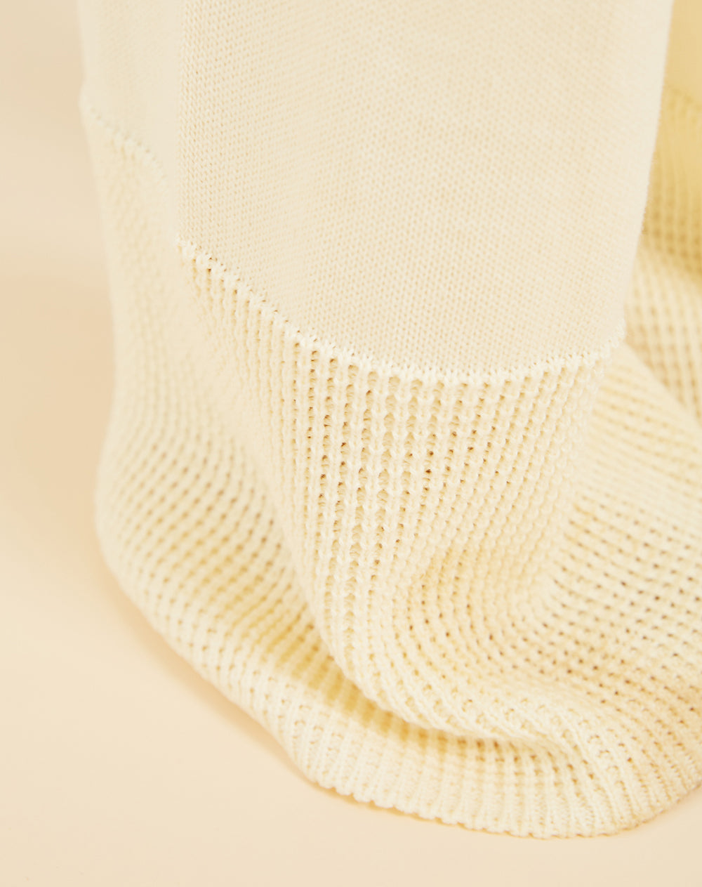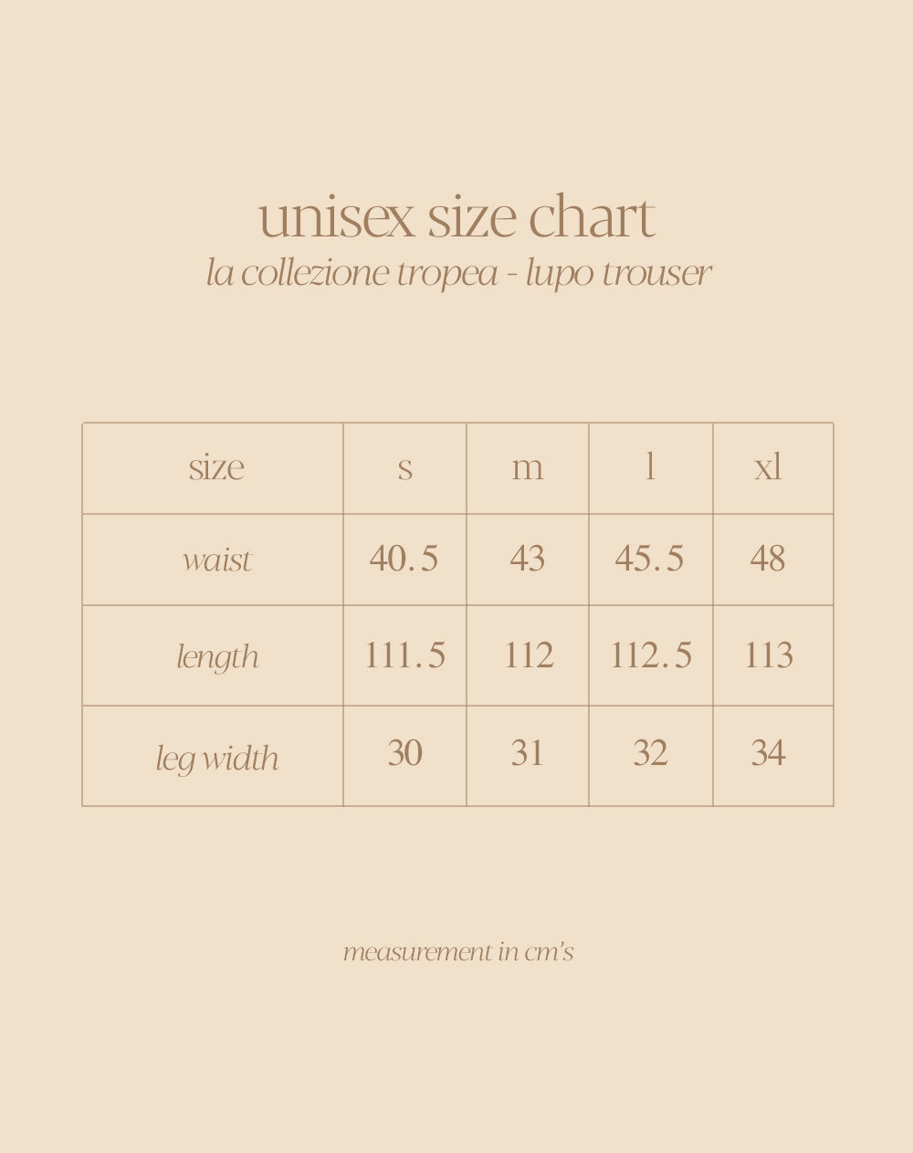 Knitted trousers with textured cuffs and tie waistband, featuring a front pocket. This piece is made to match the Lupo Shirt, inspired by Gabriella's Father Luigi. The name originates from a nickname Luigi adopted as a child - 'Lupo Di Mare' which means 'Wolf of the Sea'.