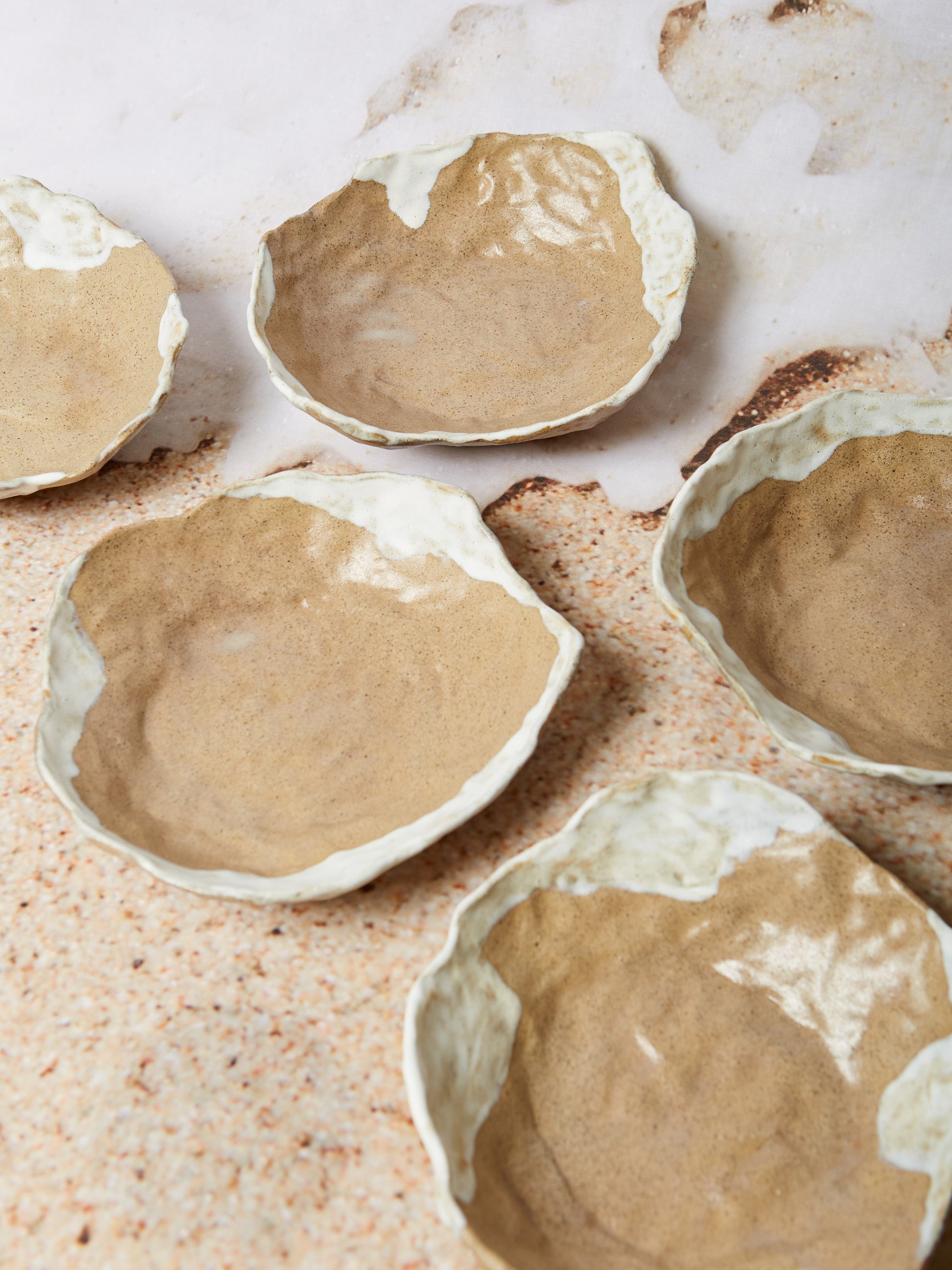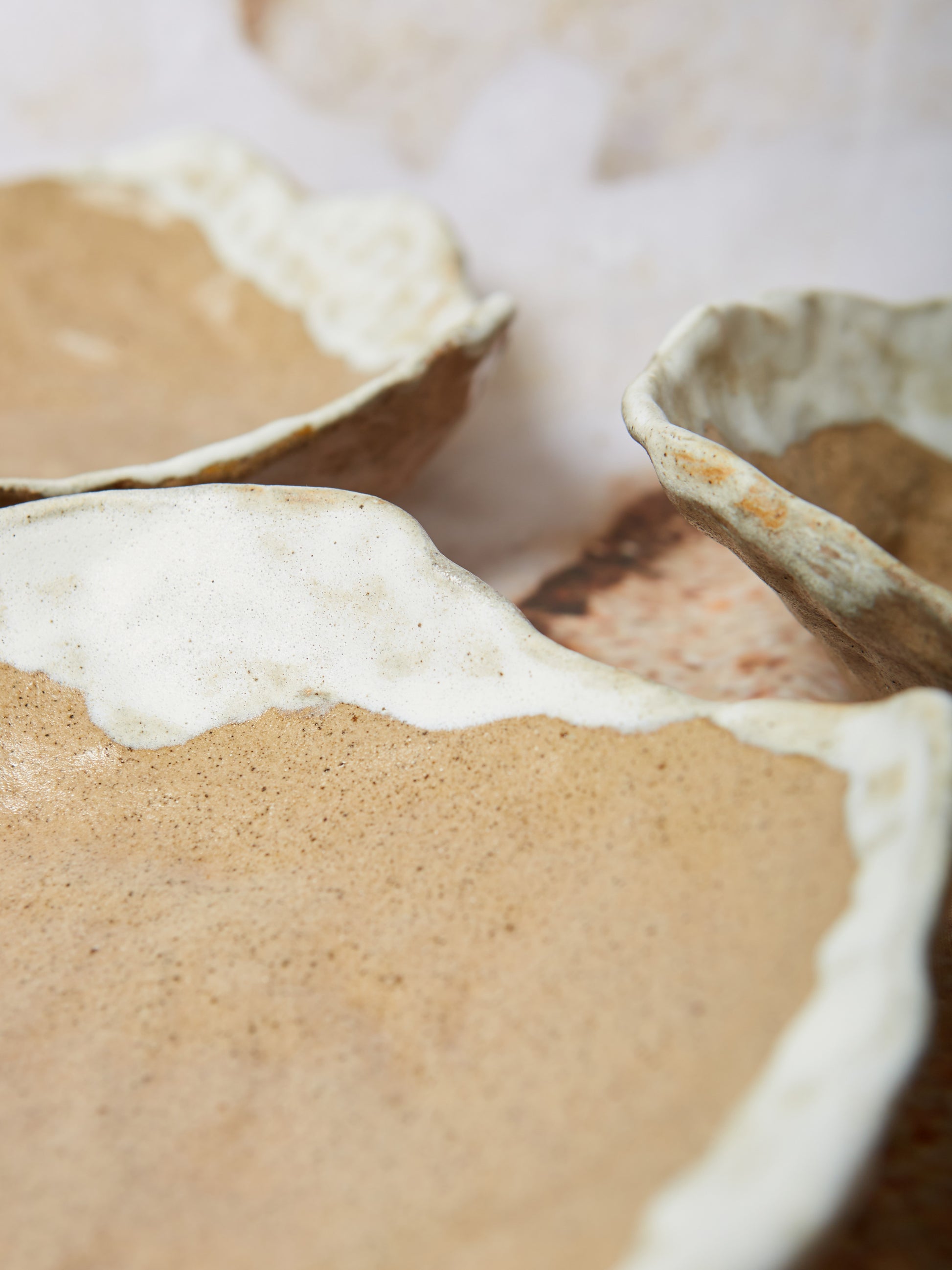 We collaborated with Grace & Greene Clayworks to create these beautiful pieces, using ancient techniques of slab building, coiling and pinching to make the unique organic forms. Inspired by the rolling waves of the sea, the glaze technique included uses thin glazes letting them cascade over the bowls - pooling in crevices and forming curves as it runs.