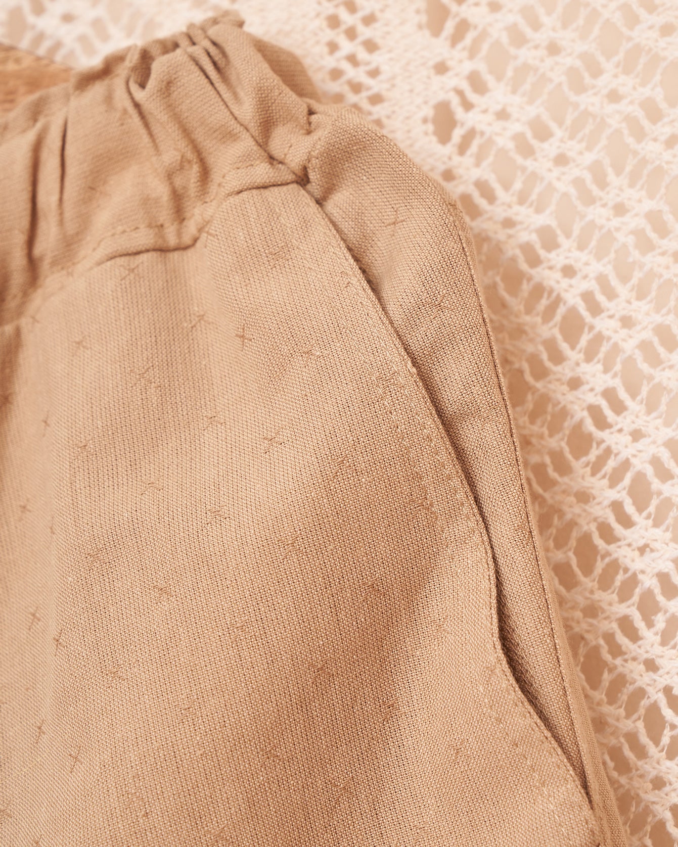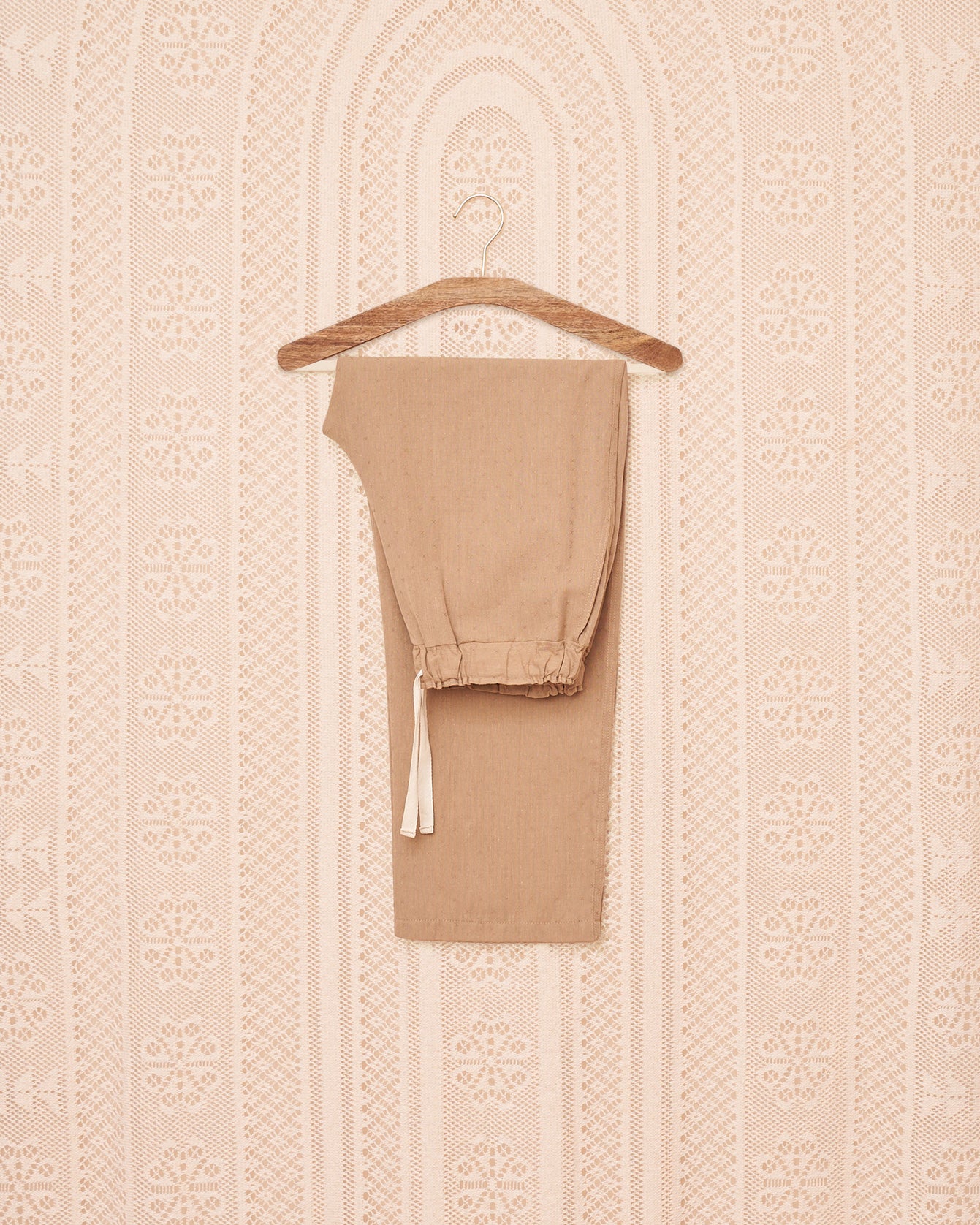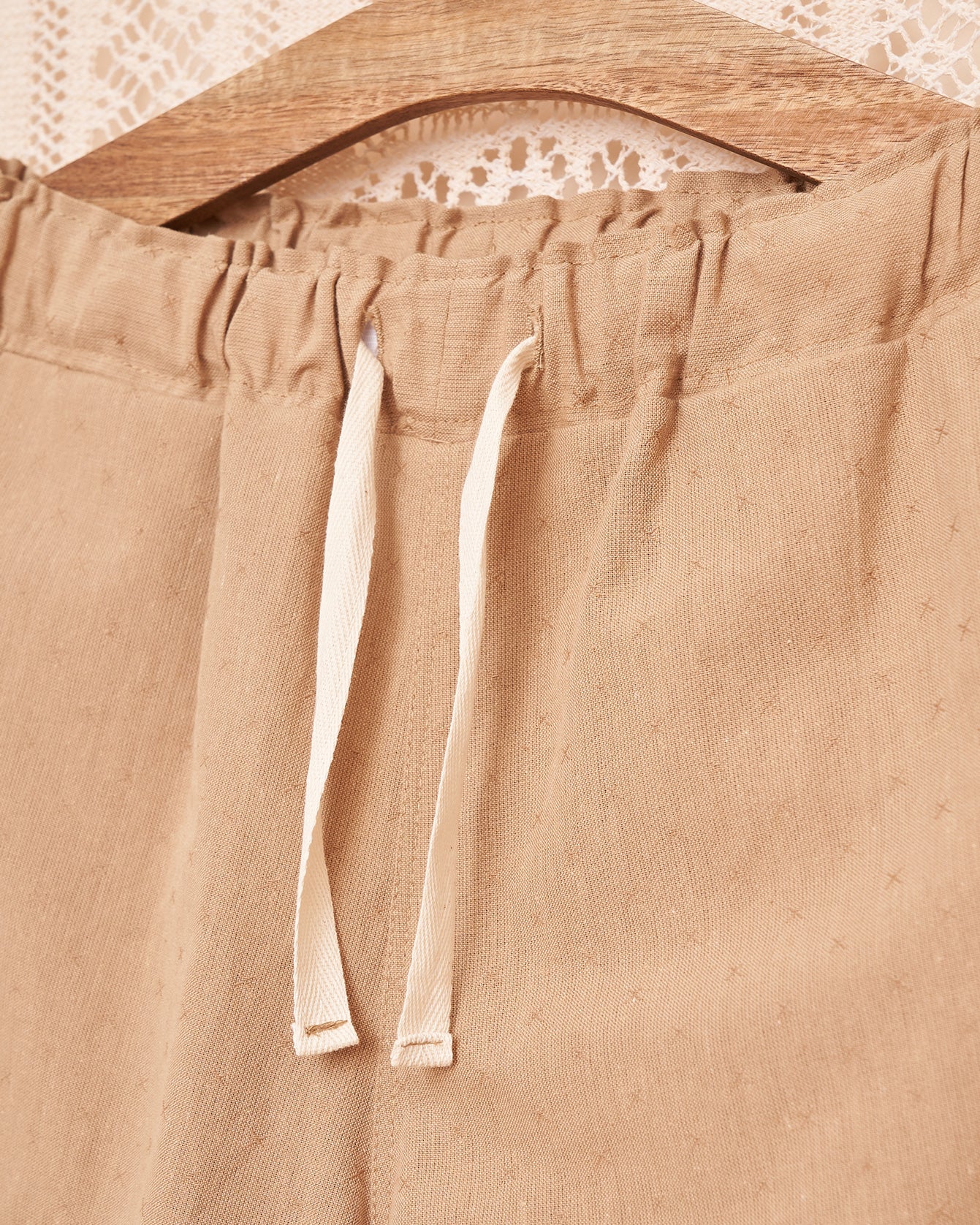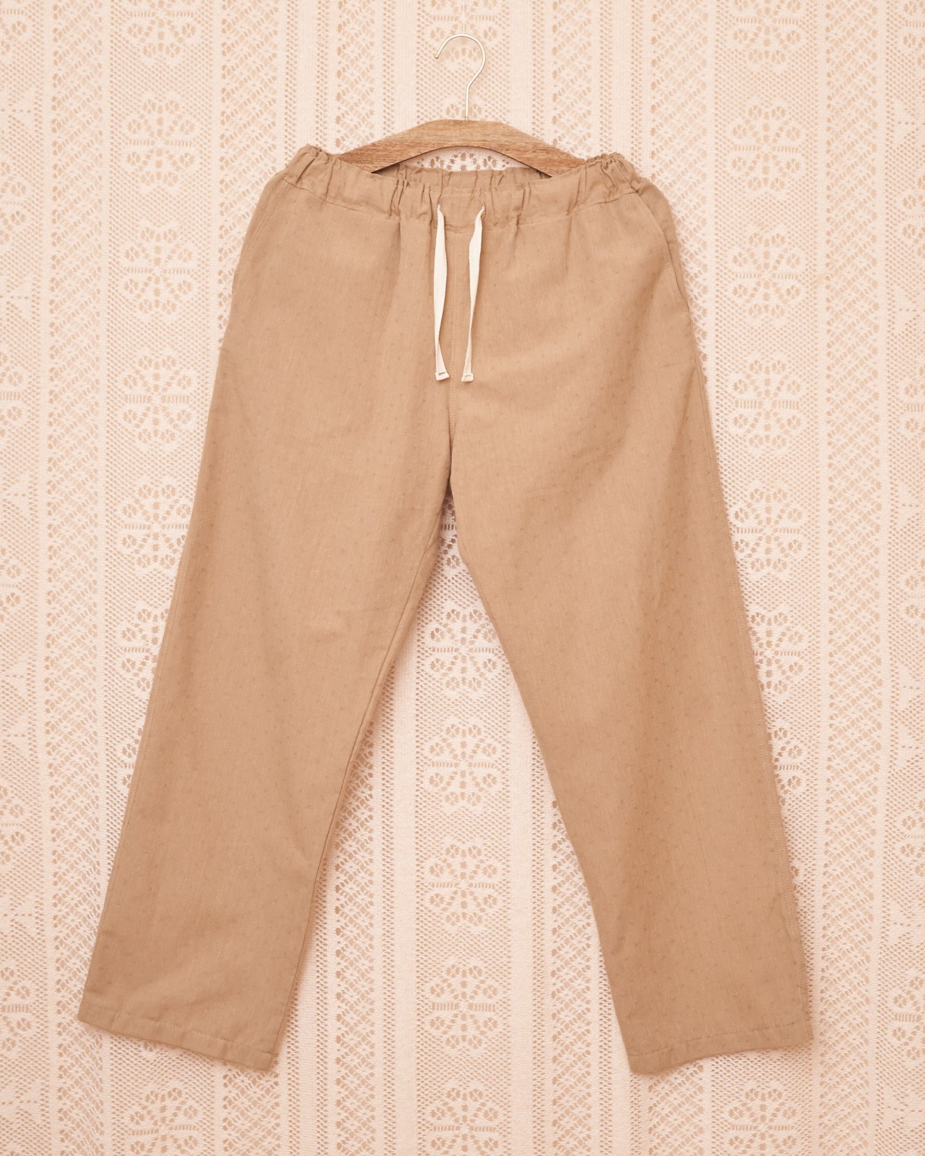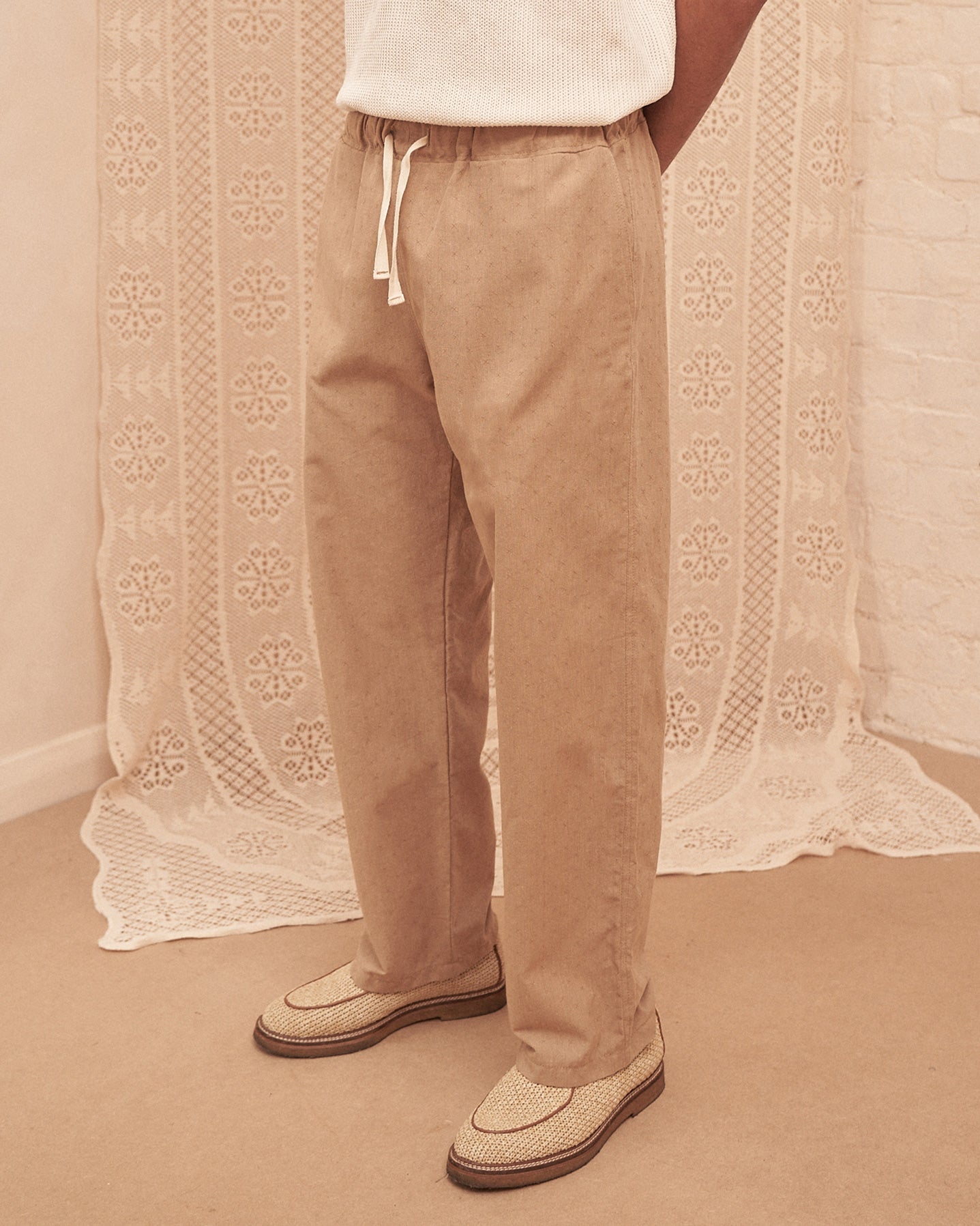 Our Spiaggia Trousers, 'Spiaggia' means 'beach' in Italian are the perfect lightweight summer trouser. Made from 100% cotton with a subtle embroidered cross detail, featuring an elasticated waistband with drawstring ties for the perfect fit and side pockets. Our most easy, comfortable trousers yet. This piece matches the Spiaggia Shirt and Spiaggia Scarf. Also looks great with the Caffè e Crema Gilet and Estate Shirt in Marrone.