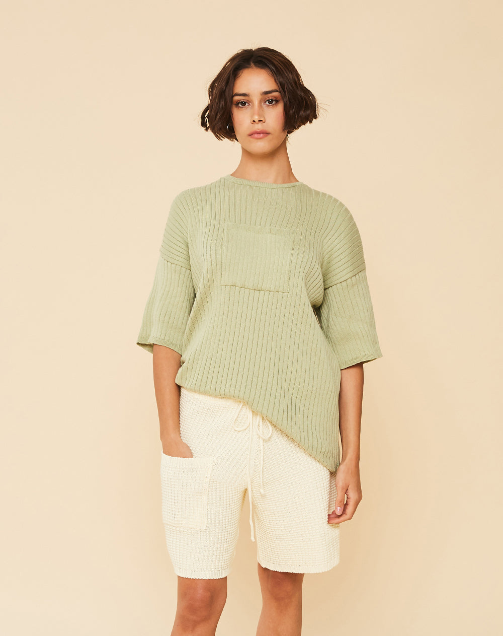 Ribbed knitted t-shirt inspired by the colours and food of Tropea. T-shirt is unisex and slouchy featuring a front pocket.