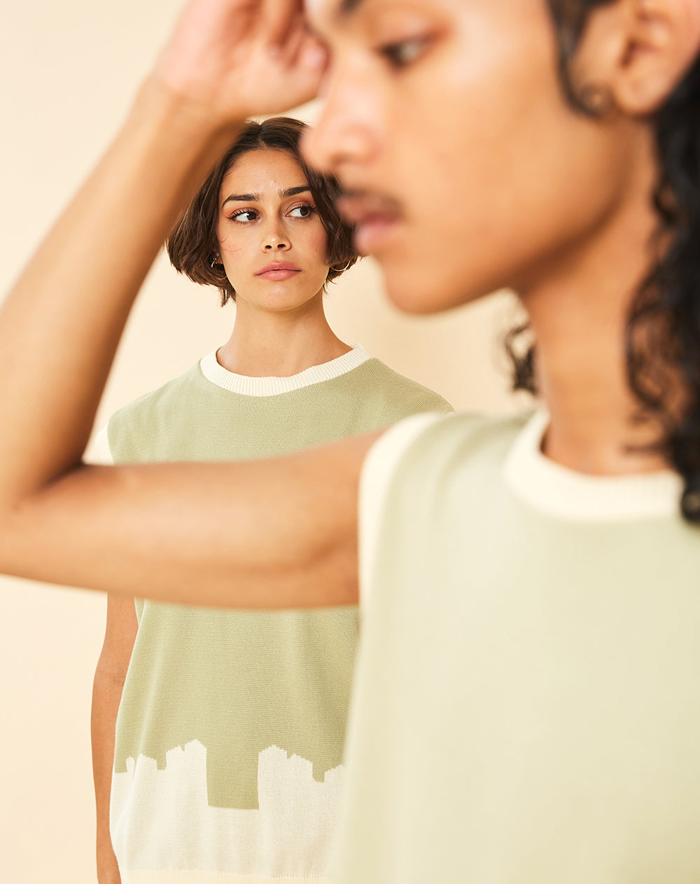 Knitted vest with jacquard design of the iconic Tropean landscape. Pistachio and Cannoli cream yarn have been blended to create this unique outline design with contrasting ribbing on the shoulders and hem. Made from 100% GOTS Organic Cotton.